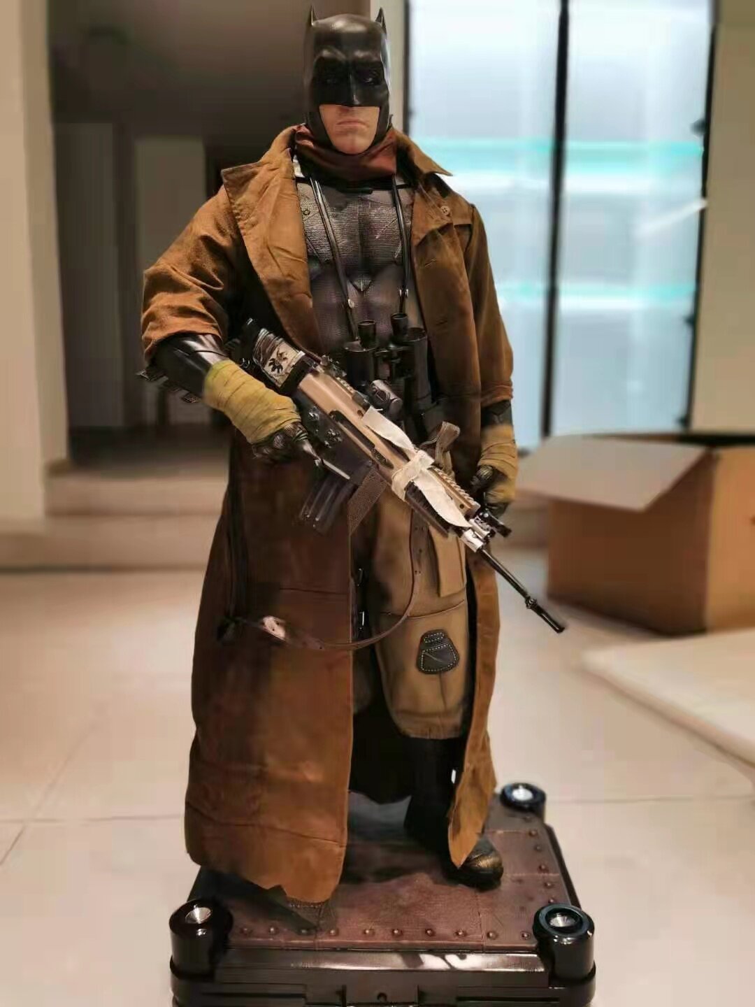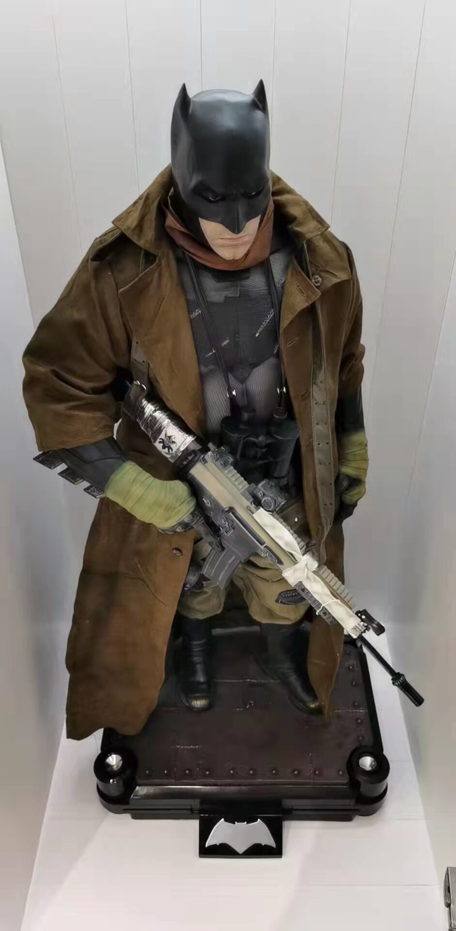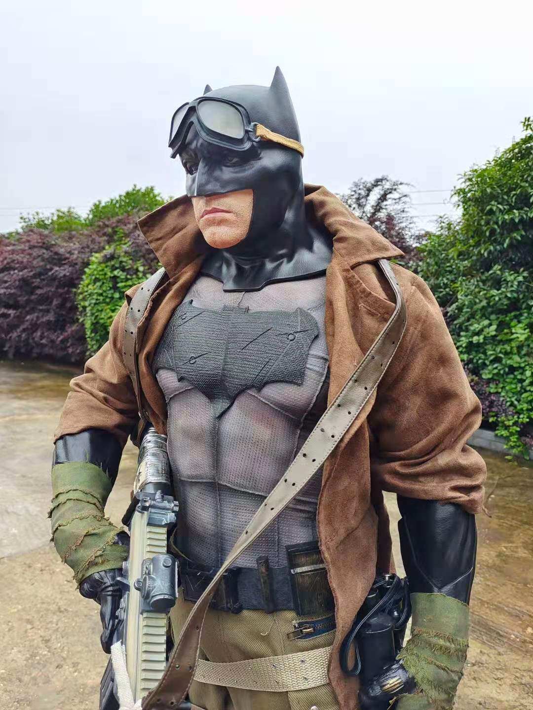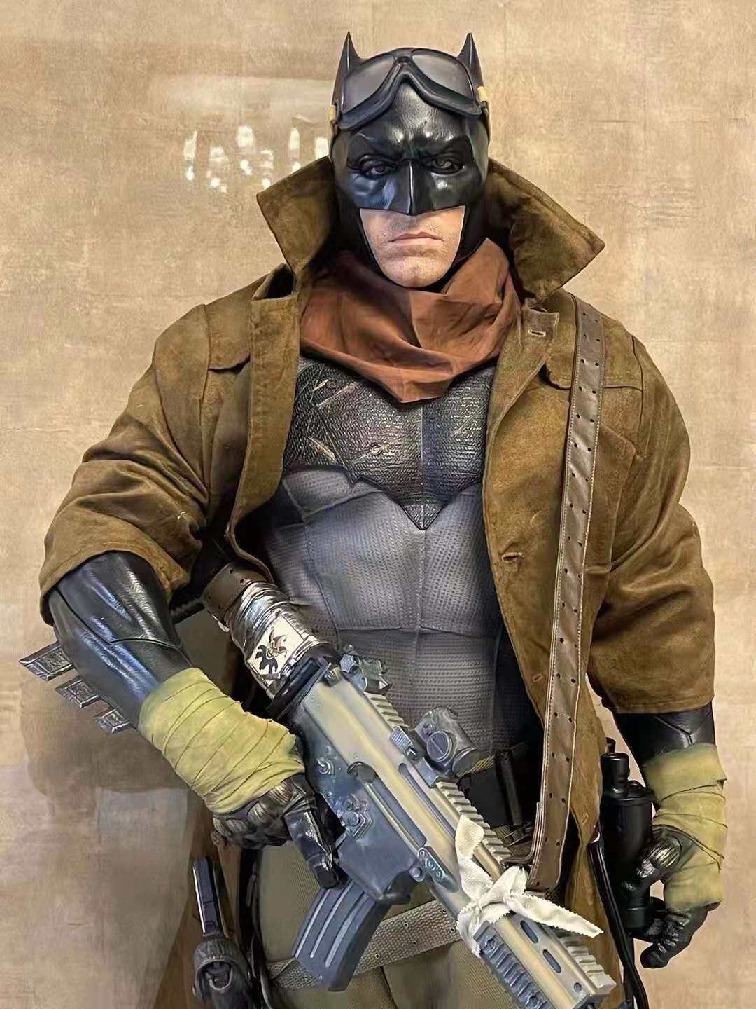 This 109 – centimeter – tall custom statue brings the iconic Desert Batman to life with striking realism. Clad in a rugged, desert – themed tactical outfit, the figure features a tattered brown trench coat, armored Batman cowl, and a weathered Batsuit with detailed textures that evoke the harshness of the desert battlefield. He wields a heavily customized assault rifle, with additional tactical gear (like pouches, gloves, and a scarf) adding to the gritty, survivalist aesthetic. The statue stands on a detailed base with a Bat – symbol plaque and ambient lighting elements, capturing Batman’s intense, determined expression and battle – ready stance. Perfect for DC collectors and fans of dark, atmospheric superhero memorabilia, this life – size – scale piece embodies the grit and resilience of Batman in a desert warfare setting.