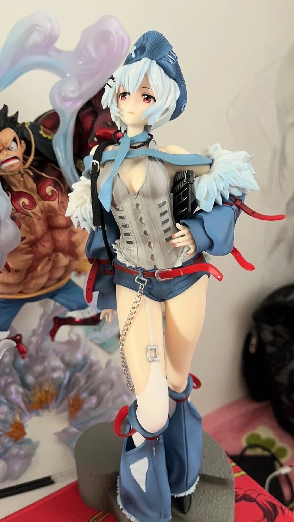 A 33cm-tall anime figure featuring a striking character with short white hair and piercing red eyes. Dressed in a stylish corset-like top and blue hat, she poses confidently with a hand on her hip and a black accessory in hand. Detailed with a waist chain and set against a vibrant anime-themed backdrop, this collectible highlights a bold color palette of light blue, gray, and red—perfect for display and anime enthusiasts.