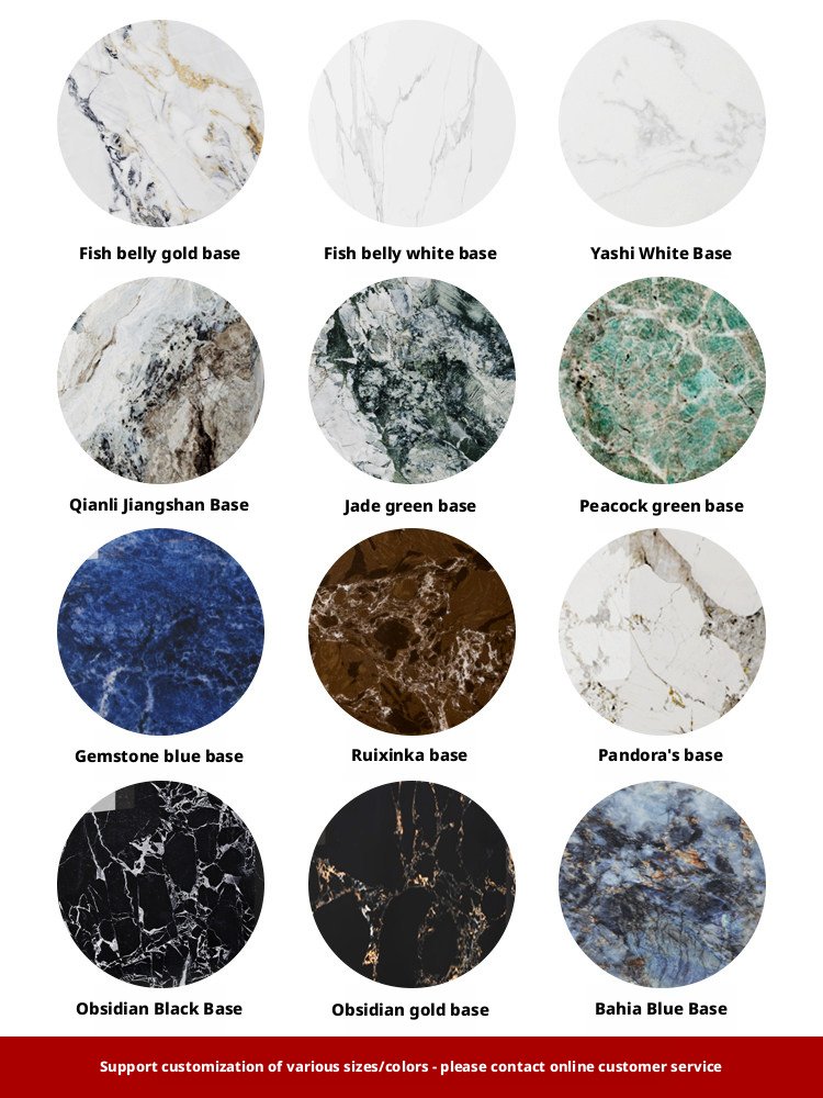 Explore our curated collection of twelve distinct marble-effect round pedestals and tabletops, each crafted to mimic the beauty of natural stone. This catalog offers a variety of colors and patterns to suit any style, from the warm veining of “Fish Belly Gold” and the classic elegance of “Carrara White” to the deep drama of “Obsidian Black” and the vibrant tones of “Jade Green” and “Sapphire Blue.”