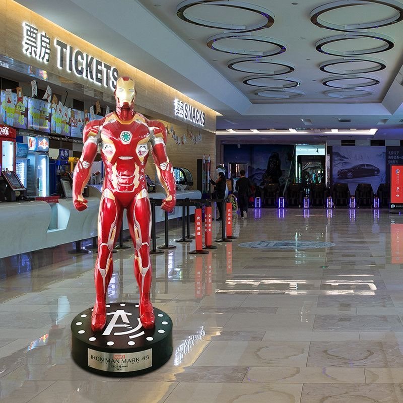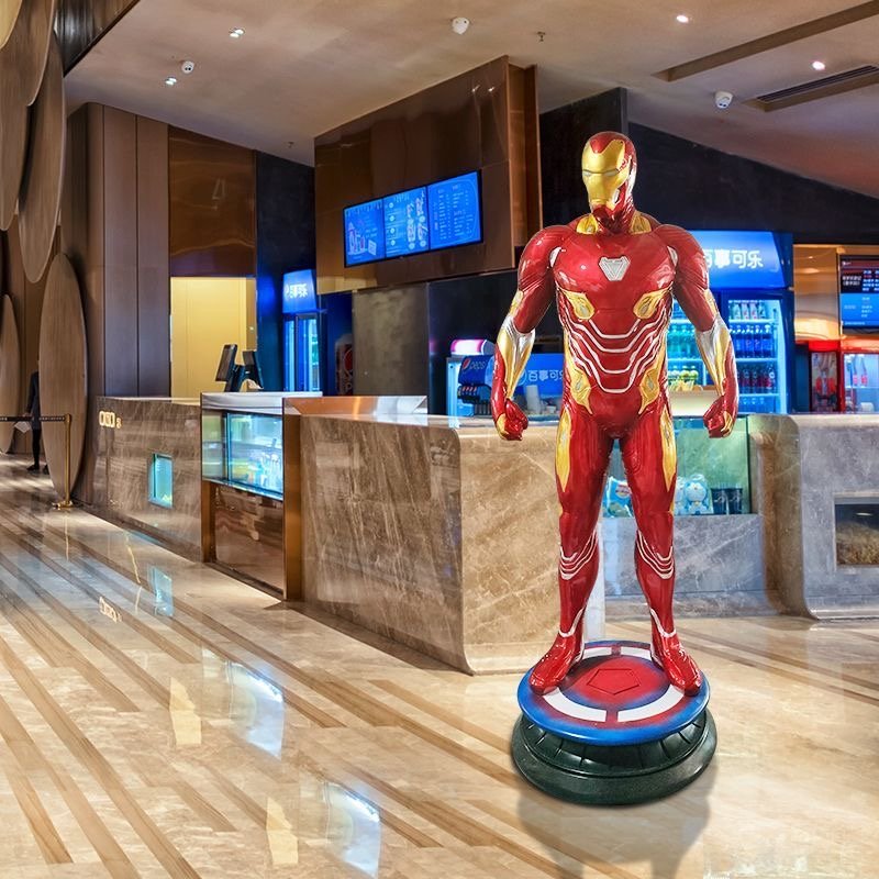 This impressive life-sized Iron Man statue stands ready for action in his iconic red and gold armor, showcasing intricate tech detailing and a confident stance. Positioned on a vibrant circular base with patriotic red, white, and blue patterns, it becomes a commanding centerpiece in any setting. The bold metallic finish contrasts strikingly with the warm wooden tones of the surrounding cafe counter and beverage displays, making it a perfect statement piece for collectors, entertainment spaces, or superhero-themed venues.