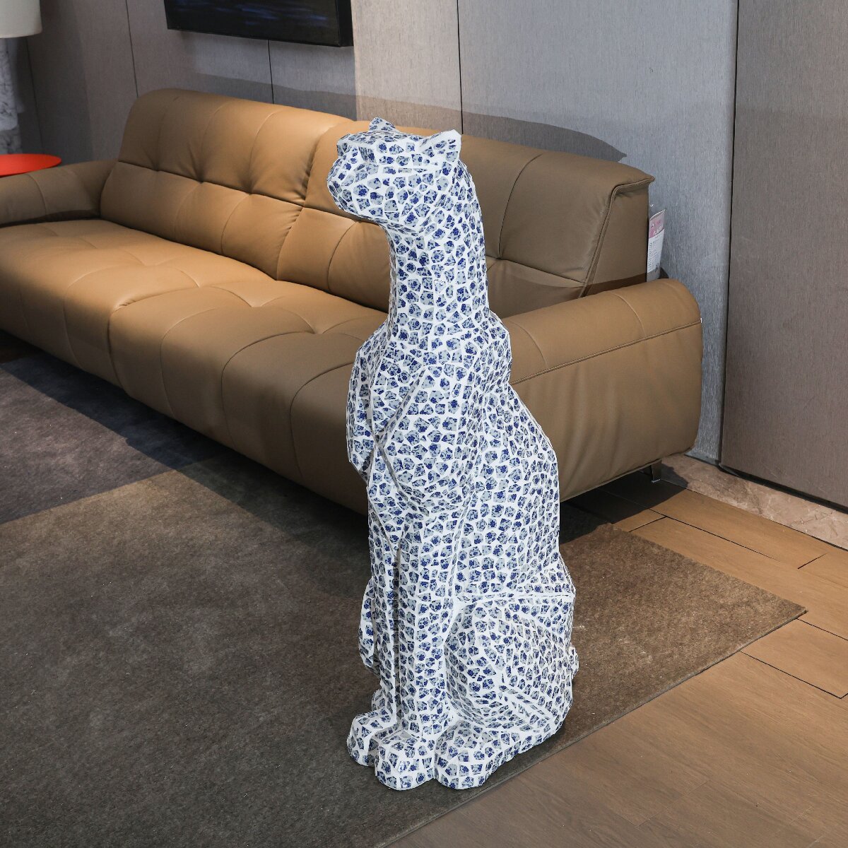 A striking Blue and White Floral Pattern leopard statue in a poised, seated position, adorned with intricate blue and white chinoiserie-style floral patterns. Its elegant form commands attention in a modern minimalist living room, set against a soft gray wall and complemented by a plush tan leather sofa. The contrast of traditional artistry and contemporary decor makes this piece a sophisticated statement for any refined interior.