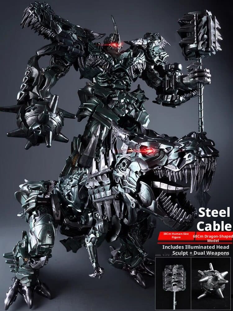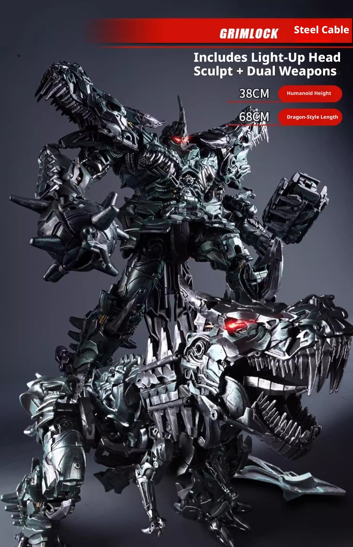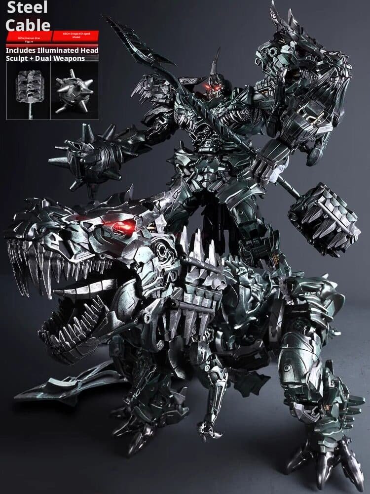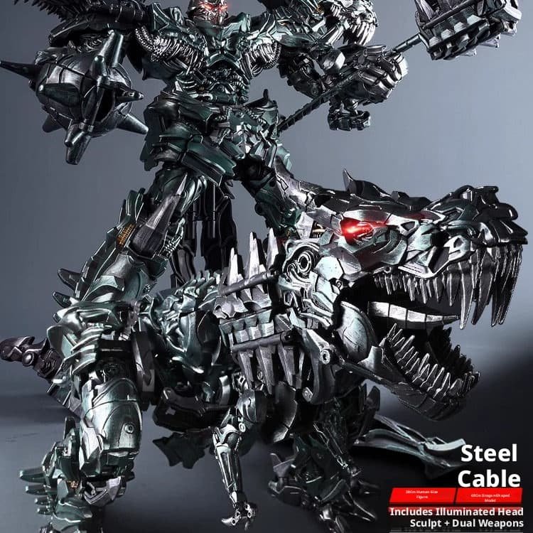 This upgraded larger – size Grimlock statue redefines the classic Transformers character with astonishing detail. In robot mode, it stands 38cm tall, featuring a menacing, battle – ready pose with intricate mechanical textures, a glowing red eye head sculpt, and dual formidable weapons. When transformed into dinosaur form, it extends to a staggering 68cm in length, showcasing a fearsome mechanical Tyrannosaurus Rex design with razor – sharp teeth, articulated joints, and a rugged, metallic finish. Crafted with high – quality materials, the statue balances durability and realism, from the weathered look of its armor to the dynamic details of its dinosaurian features. Ideal for Transformers collectors, sci – fi enthusiasts, or anyone seeking a show – stopping display piece, this Grimlock statue combines the thrill of transformation with museum – worthy craftsmanship, making it a must – have for any collection.