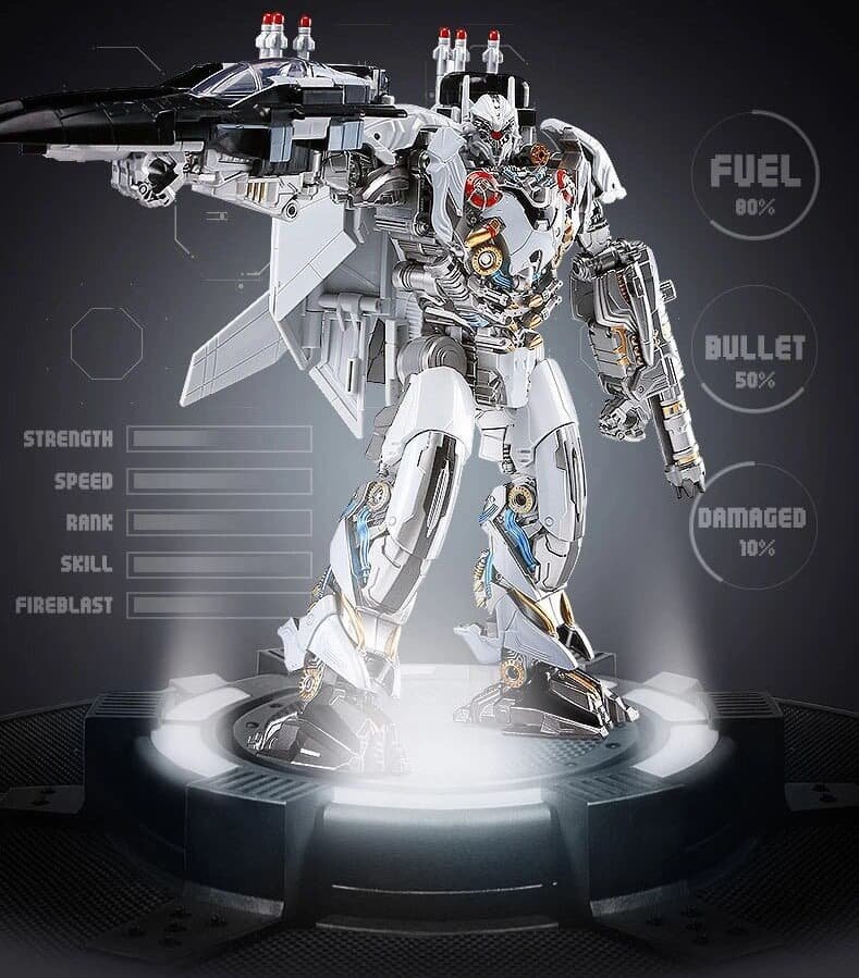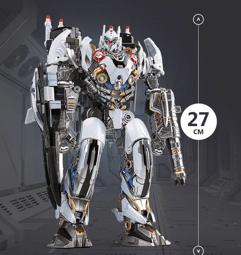 This upgraded larger – size Nitro Zeus alloy – edition transformable robot brings the iconic Transformers: The Last Knightcharacter to life with enhanced scale and detail. In robot mode, it stands at an imposing height, featuring a meticulously crafted mechanical structure with silver – toned armor, gold accents, and intricate paneling that replicates the movie’s futuristic design. The jet – fighter transformation mode showcases a sleek, aerodynamic aircraft with precise detailing, from the cockpit to the wing components. Made with high – quality alloy and durable plastics, the statue ensures both sturdiness and a realistic, weathered metal finish. Ideal for Transformerscollectors, sci – fi enthusiasts, or anyone seeking a museum – worthy display piece, this Nitro Zeus statue captures the power and sophistication of the movie’s Decepticon warrior, making it a standout addition to any collection.