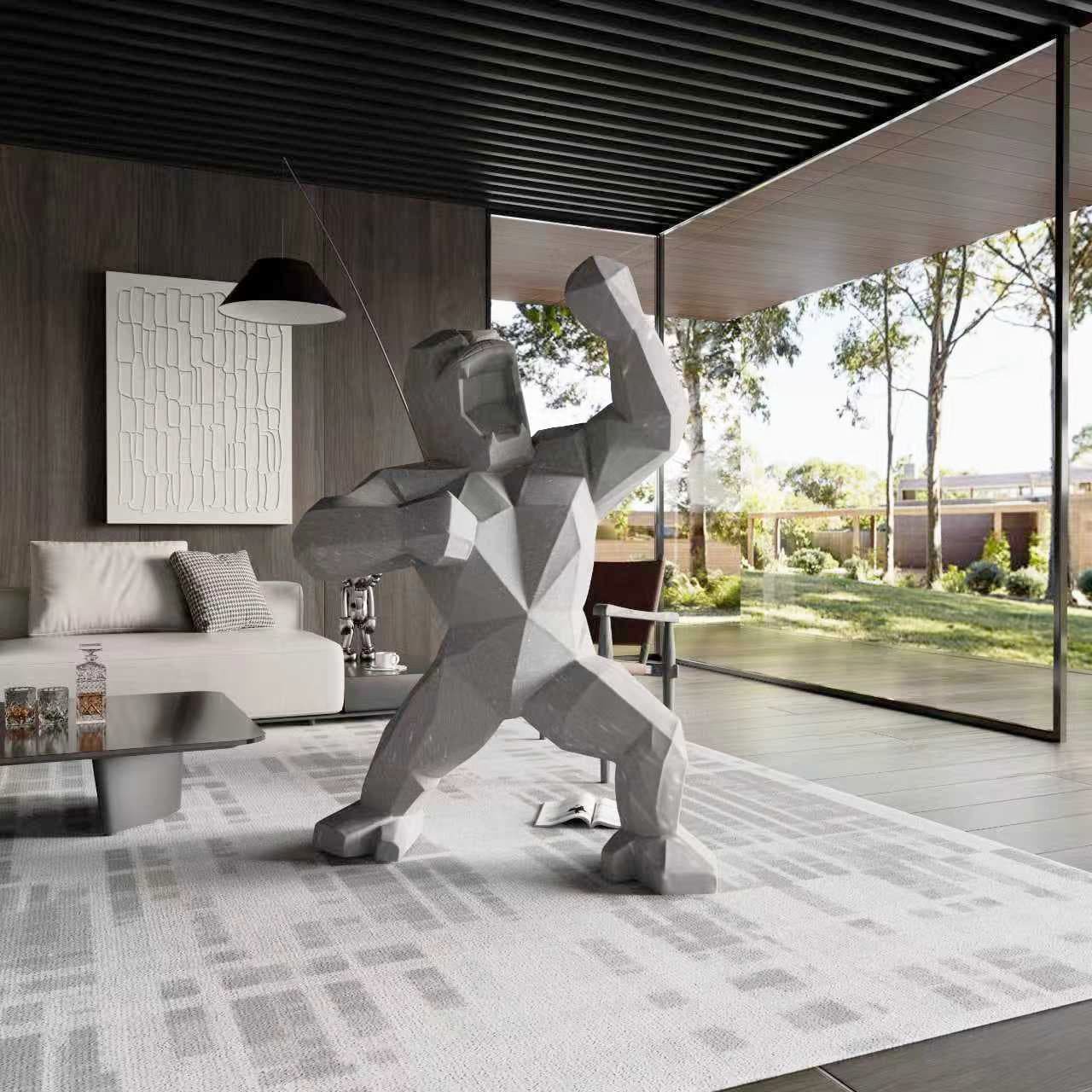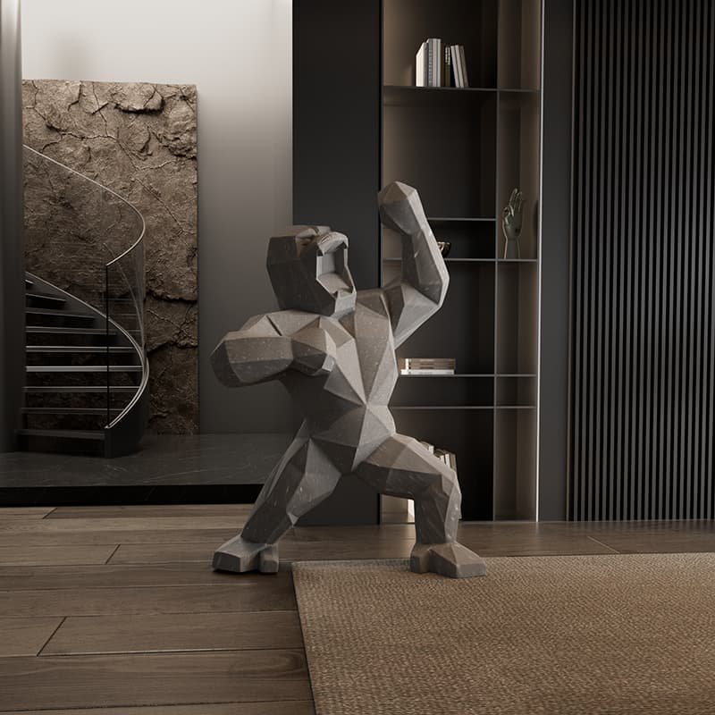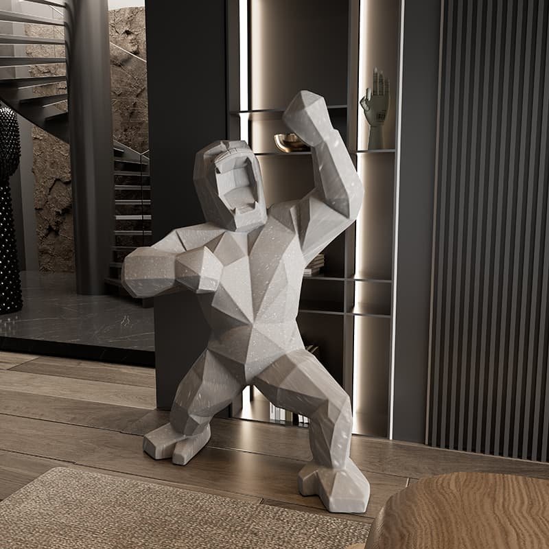 This bold, contemporary sculpture features a roaring ape, dynamically posed with one fist raised and its powerful form rendered entirely in sharp, faceted planes. Crafted from smooth light grey stone-look material with subtle texture, it stands on a natural jute rug, surrounded by a modern interior with dark vertical panels, warm-lit display shelves, and a sleek spiral staircase. A striking fusion of primal strength and minimalist design, perfect as a statement piece in sophisticated living or commercial spaces.