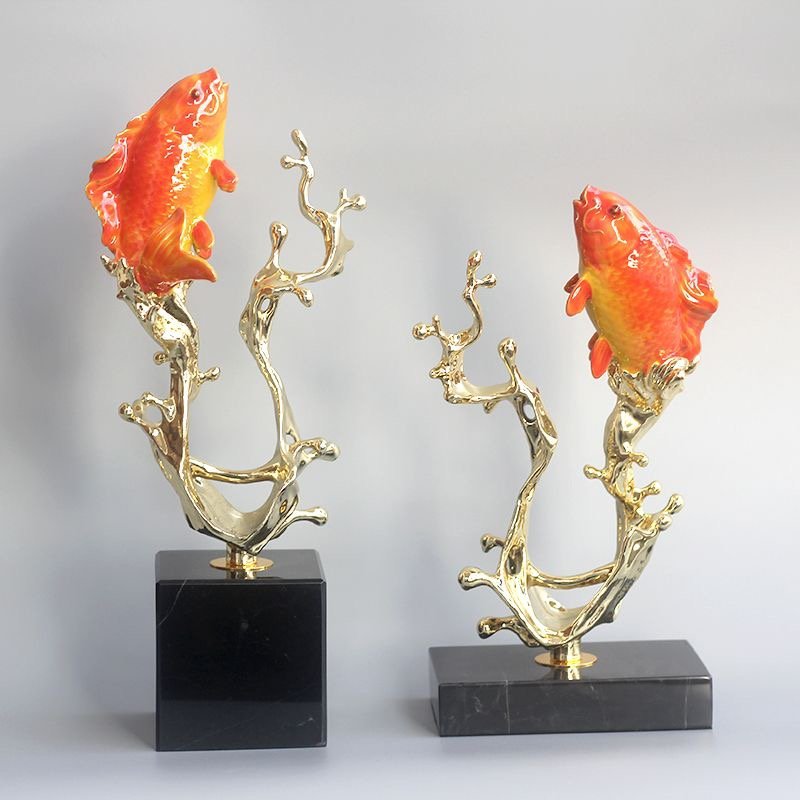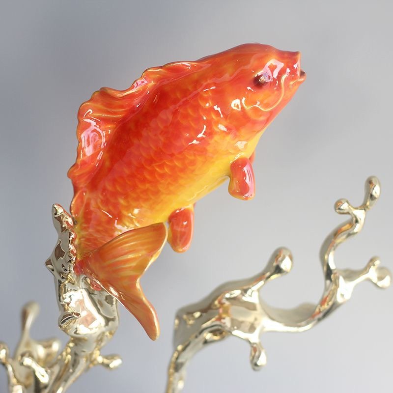 This elegant sculpture features a glossy orange koi fish with finely detailed scales, gracefully balanced on a dynamic arrangement of swirling gold metal branches. The abstract golden tendrils evoke flowing water, supporting the fish in a lively, upward-reaching pose. Set on a sleek black marble base against a soft gray background, the piece combines vibrant color and fluid form, symbolizing prosperity and vitality for any modern interior.